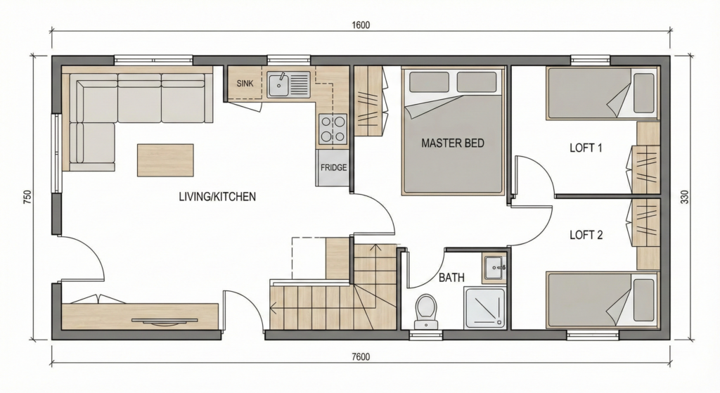 La conception de la Tiny House Familiale Compacte repose sur une répartition équilibrée des volumes. L’objectif est de garantir à chaque occupant un espace identifiable, tout en conservant une sensation d’ouverture et de continuité. Cette approche permet de répondre aux contraintes de l’habitat compact sans sacrifier le confort d’usage.