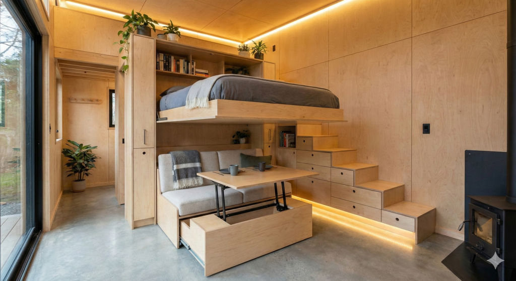 Le mobilier intelligent transforme l’aménagement intérieur de la tiny house en un espace polyvalent et évolutif.